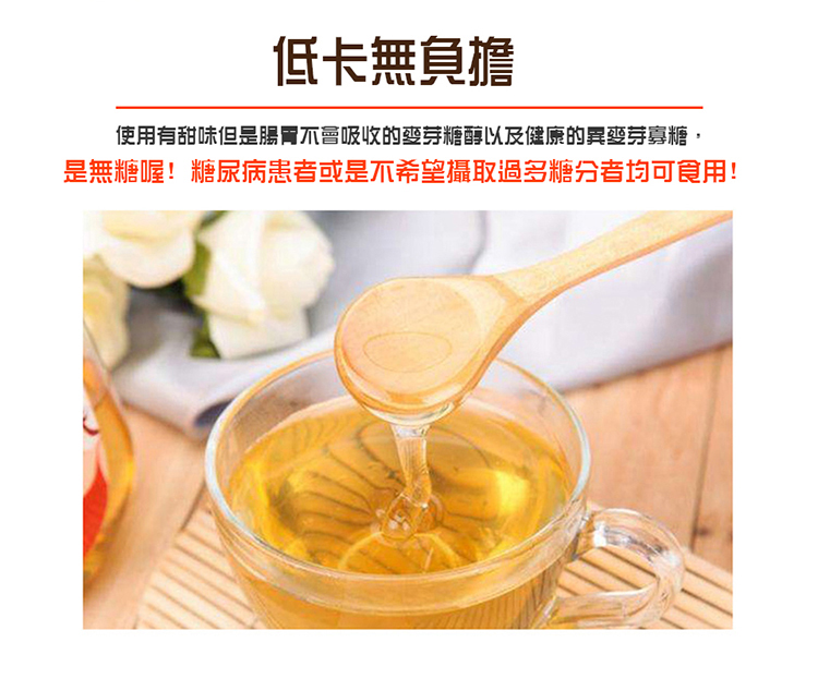 營養標示:熱量29大卡/蛋白質 0公克/脂肪 0公克/飽和脂肪0公克/反式脂肪0公克/碳水化合物11.5公克/糖0公克/膳食纖維1.8公克/麥芽糖醇8.3公克/鈉0毫克