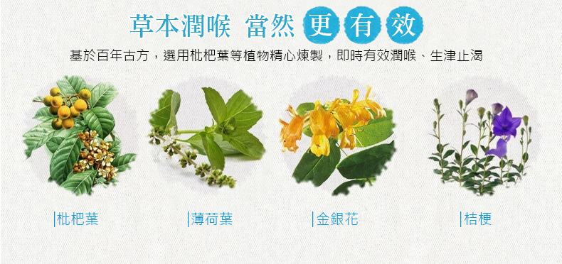 砂糖、ブドウ糖、ハーブ抽出物(ビワ葉、スイカズラ花、キキョウ根、リコリス根)、香料、着色剤(カラメル)、ハッカ