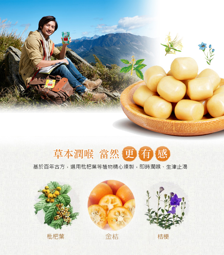 ・ビワやスイカズラなどの漢方をブレンドしたソフトキャンディはハーブのスッとする味にキンカンの酸味と甘みが加わり喉を爽やかにします。