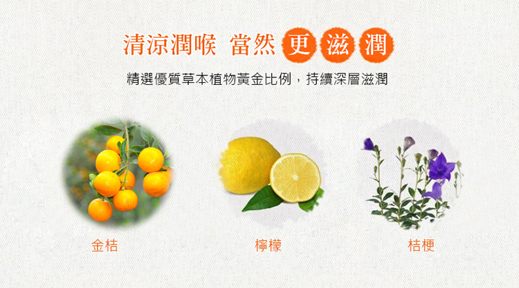 砂糖、ブドウ糖、ハーブ抽出物(ビワ葉、スイカズラ花、キキョウ根、リコリス根)、キンカン抽出物、香料、酸味料