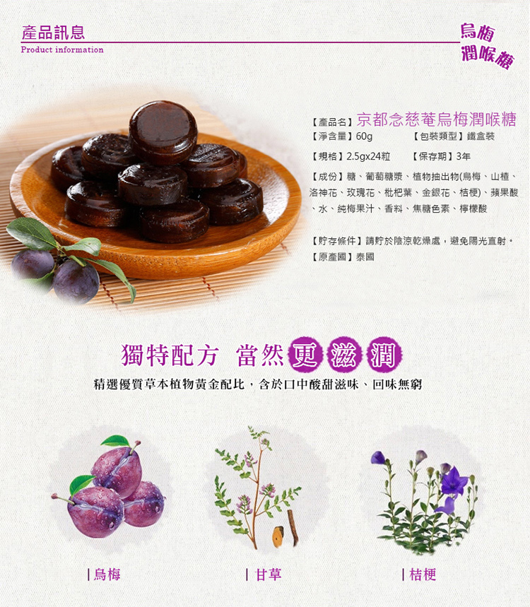 砂糖、ブドウ糖、ハーブ抽出物(ビワ葉、スイカズラ花、キキョウ根、リコリス根)、植物抽出物(梅、サンザシ、ローゼル、バラ花)、梅ジュース、香料、酸味料、着色剤(カラメル)